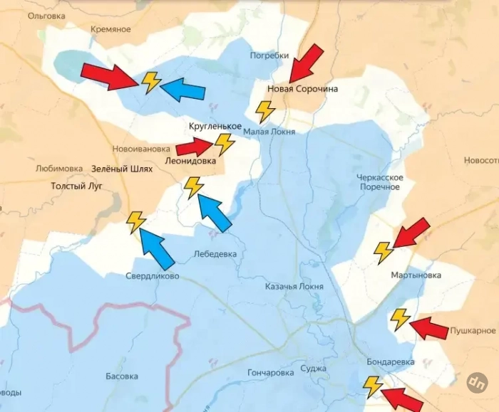 Российские силы продолжают продвижение с юго-восточного направления в сторону города Суджа. Кроме того, в районе Казачьей Локни был уничтожен склад боеприпасов противника, что существенно ослабило его боевые возможности на этом участке.