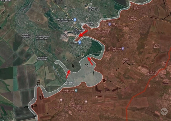 В Торецке российские войска во главе с пехотными подразделениями продвинулись к южной окраине города. В центре Торецка интенсивность боев оставалась высокой: Российские войска захватили два дома по улице Дружбы и пытаются прорваться к Дворцу культуры через центральный парк.