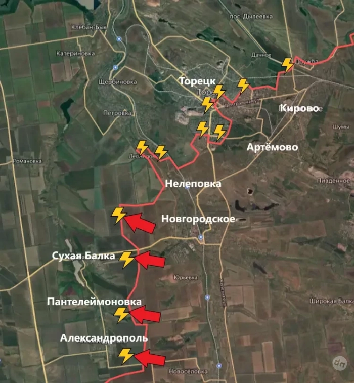 В Торецке (Дзержинске) идут ожесточённые городские бои с переменным успехом. Стороны активно используют беспилотную авиацию. Практика других штурмов наглядно показывает, что для быстрого освобождения населённого пункта необходимо взять его в мешок, перерезав снабжение и оставив лишь один путь для отступления гарнизона, который будет находиться под огневым контролем. В Торецке этого нет - враг завозит провизию и боеприпасы, а также новую живую силу. Без какого-то переломного момента встречные бои в городе могут продолжаться ещё долго. Западнее Новгородского (бывший Нью-Йорк) ВС РФ продвинулись чуть западнее. Также продвижение есть и южнее - в направлении Сухой Балки, Пантелеймоновки и Александрополя, информирует PulsePen.