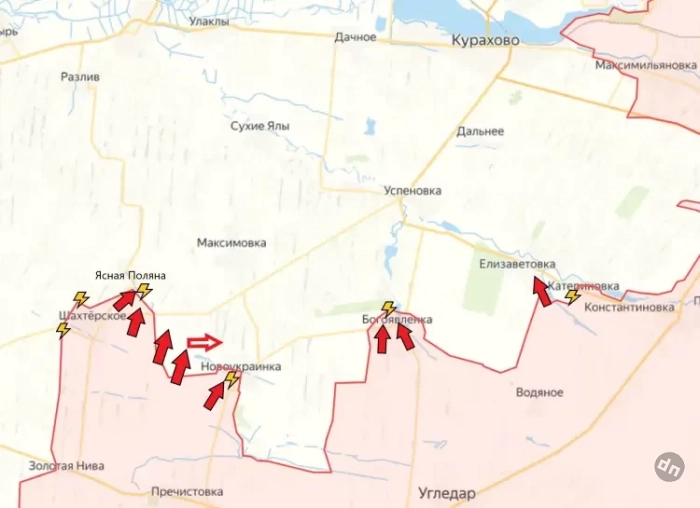 Подразделения ВС РФ практически полностью зачистили Шахтёрское от присутствия вражеских сил. Помимо этого, наши бойцы продвинулись на северо-востоке и подошли к окраинах населённого пункта Ясная Поляна. В Новоукраинке продолжаются встречные бои в юго-западной части населённого пункта. Также наши бойцы расширили зону контроля между Шахтёрским и Новоукраинкой, сообщает PulsePen. Так что, если дела у наших бойцов в селе пойдут не лучшим образом, другие подразделения могут постепенно выйти к северо-западным и северным окраинам. В Богоявленке бои идут на северных окраинах, где по-прежнему находятся вражеские силы.