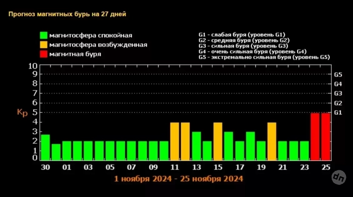 13 и 14 ноября будет небольшое затишье. 15 ноября прогнозируются солнечные вспышки, геоудары достигнут от четырех до пяти баллов, возможна магнитная буря. В период с 16 по 19 ноября магнитосфера будет спокойная, без потрясений.