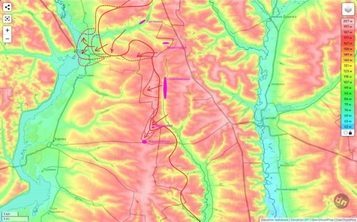 Одновременно с этим очевидно мы будем пробовать наступать на этот районный центр Харьковской области с севера (вдоль реки Оскол).