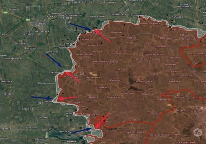 На Покровском направлении российские войска давят на участке Николаевка-Гродовка в направлении Мирнограда. Под контроль российских войск перешли Селидово и Вишневое. В Новодмитровке ВС РФ расширили контроль территории и продвинулись на глубину до 1.3 км. Имеются тактические успехи в районе Измайловки.