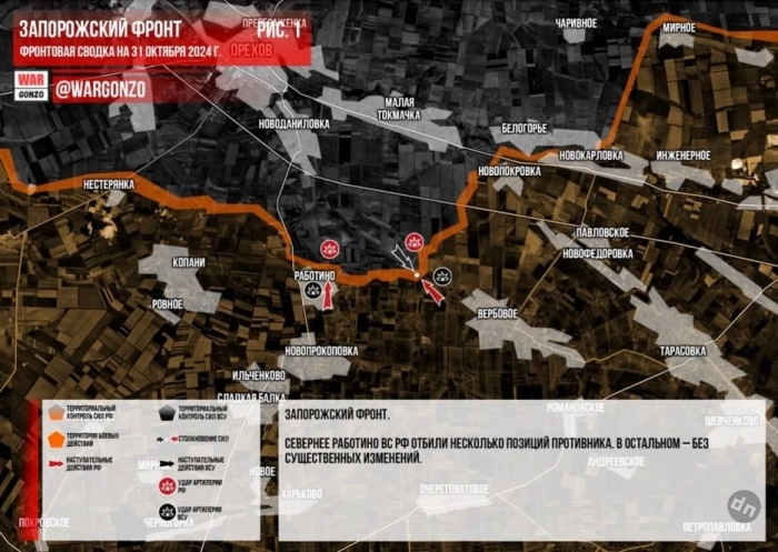 На Запорожском направлении севернее Работино ВС РФ отбили несколько позиций противника. В остальном - без существенных изменений.