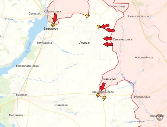 На Боровском направлении продолжаются бои южнее Кругляковки. Сообщений о начале штурма Загрызово по-прежнему не поступало. Идут боестолкновения на подступах к Лозовой. Сообщается, что на восточных окраинах у врага имеются довольно серьёзные укрепления, поэтому возможен заход с севера. Армия России освободила Першотравневое (в переводе на русский - Первомайское), что южнее Вишнёвого. Об этом сообщило Минобороны России.