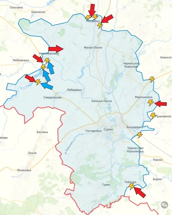 В свою очередь PulsePen отмечает, что в Кореневском и Суджанском районах - без особых изменений. Бои идут у Новоивановки, Зелёного Шляха и Нижнего Клина на западном участке. А на восточном участке - в районе Мартыновки и Плёхово.