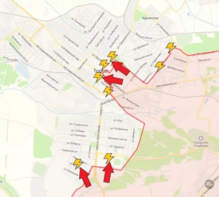 За последние два дня ВС РФ немного расширили зону контроля в центре Торецка. Однако, некоторые источники утверждают, что эти территории уже были под контролем ВС РФ, а сейчас мы их отбили обратно после того, как враг отбил их у нас. В общем, идут ожесточённые бои с переменным успехом.