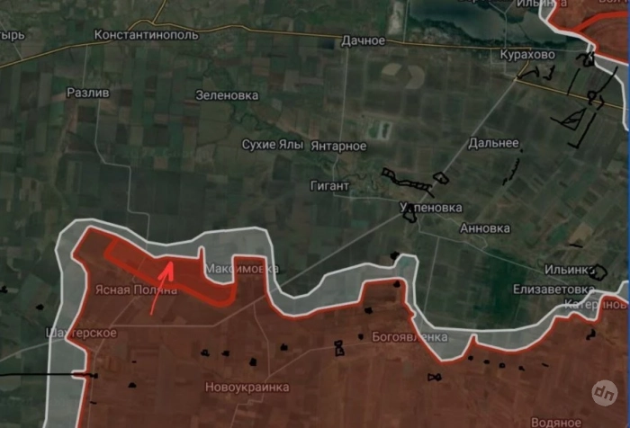 На Константинопольском направлении севернее Ясной Поляны и восточнее Максимовки российские войска продвинулись на участке шириной до 6.3 км на глубину до 2 км., давят в западном и северном направлениях.