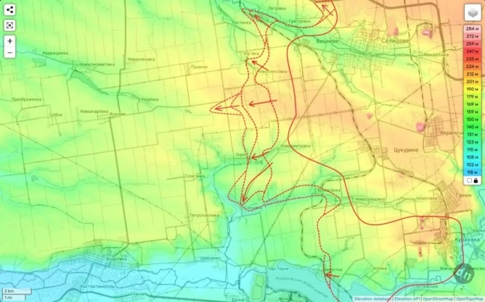 Более того уже поздно вечером пошли сообщения, что мы продолжили здесь расширять свое присутствие. Утеря Солнцевки, от которой до дамбы (а значит и дороги) в Курахово всего 4 км, фактически ставит крест на возможностях ее использования гарнизоном города. А выход на холмы южнее открывает просто шикарный вид на весь город.
