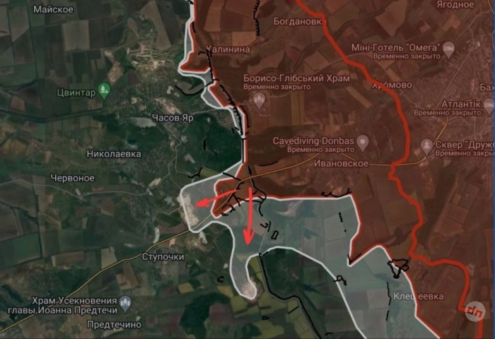 На ЧасовЯрском направлении южнее Часового Яра российские войска ведут штурмовые действия в районе рудника «Юго-восточный», имеются тактические успехи.