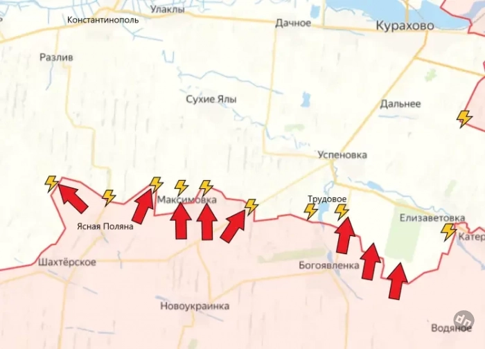 Подразделения ВС РФ заняли позиции западнее и восточнее Максимовки. Бои идут к северу от населённого пункта. Стоит отметить, что ещё не все источники подтвердили зачистку северных окраин Максимовки. Враг подтверждает существенное расширение зоны контроля севернее, северо-восточнее и восточнее Богоявленки. Наши бойцы вплотную подошли к урочищу Лесная Дача, что располагается южнее Елизаветовки, и начинают огибать его с запада.