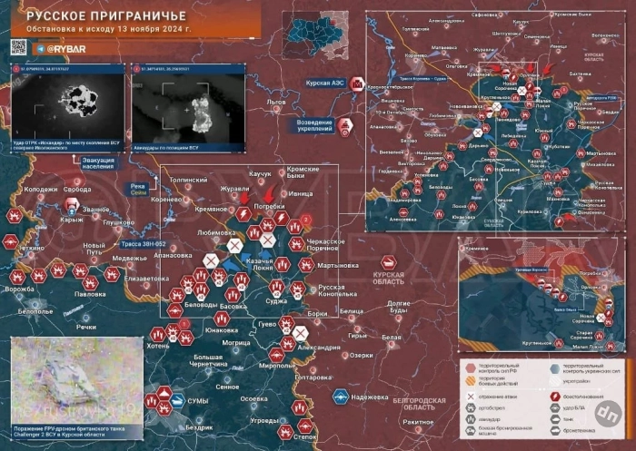 В свою очередь Telegram-канал "Два майора" пишет о том, что в Курской области продолжаются тяжёлые бои за Плёхово и н.п. Новая Сорочина, враг бьёт из ствольной артиллерии и применяет множество дронов. О сосредоточении усилий противника говорит уничтожение морпехами нашей 155 бригады тяжёлого английского танка "Челенджер 2", довольно-таки редкого и сложного в эксплуатации танка. Сам факт его переброски ВСУ в качестве резерва в Курскую область говорит о намерении врага во что бы то ни стало удерживать занятые рубежи в нашем регионе.