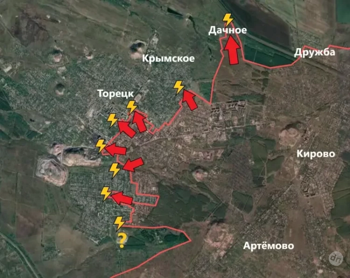 Продолжается штурм Торецка (Дзержинска). После прорыва подразделений ВС РФ на север идёт зачистка территории Дачного от вражеских сил, сообщает PulsePen. Довольно долго наши бойцы не могли продвинуться в сторону Дачного от Дружбы, а затем успешно атаковали с другого участка.