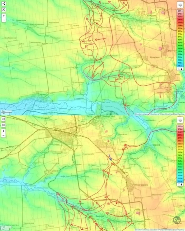 Третье направление нашего движения - севернее реки Солёная. Здесь наши части, после выхода к окраинам н.п. Жёлтое, подтягивают фланги. Общая задача здесь, продвигаясь далее на север, выйти к южным окраинам Покровска.