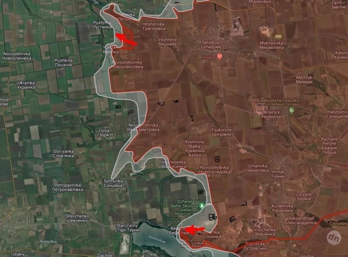 Российские войска расширили контроль территории вдоль северного берега Кураховского водохранилища в направлении Берестки.