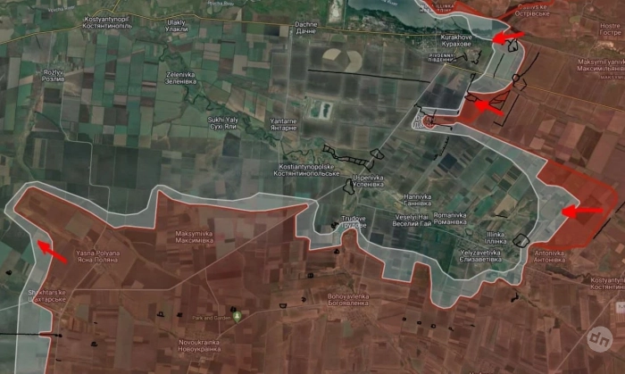 Российские войска имеют тактические успехи, продвинулись на участке шириной до 4.7 км от дороги южнее балки Долгая до северной окраины Антоновки. Вместе с этим ВС РФ имеют тактические успехи северо-западнее Ясной Поляны.