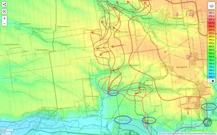 Тем временем в районе Берестков ситуация для Киева складывается крайне неблагоприятно. На вечер они удерживали лишь самую западную окраину, и есть все основания полагать, что сегодня они потеряют и этот участок. Дальше за холмом расположены Старые Терны, но с учетом ухудшающейся ситуации в Курахово, это село теряет свое стратегическое значение.
