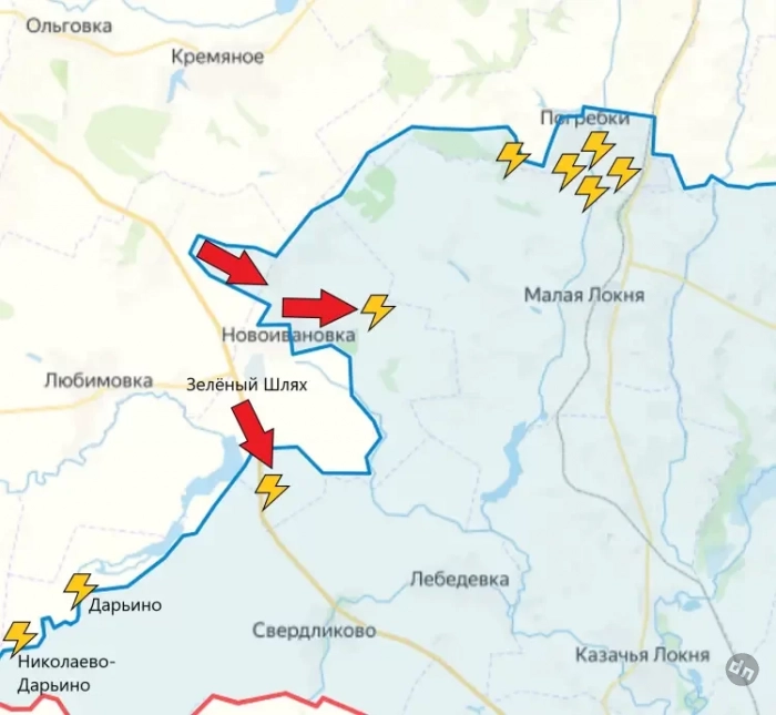 Основные боестолкновения идут в северо-западной части места прорыва ВСУ - в районе Дарьино и Николаево-Дарьино, Новоивановки и Зелёного Шляха, южнее Погребков.