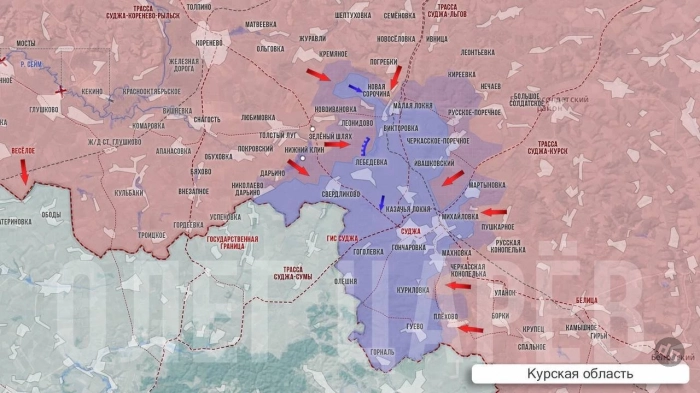 По данным Telegram-канала "Два майора", в Суджанском районе ВС России с тяжёлыми боями продвинулись в населённом пункте Дарьино. При этом противник провёл 2 контратаки.