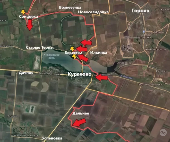 На Кураховском направлении подразделения ВС РФ заняли южную часть Сонцовки. Предположительно, противник ещё находится на северо-западных окраинах населённого пункта. Если это и так, то осталось ему недолго. В скором времени село будет освобождено Армией России. И тогда откроется путь (хотя, технически он уже открыт) на Старые Терны. Да, ВСУ подорвали дамбу в западной части Кураховского водохранилища, так что продвижение дальше на юг будет серьёзно осложнено. Но взятие Старых Терн позволит установить огневой контроль над единственной оставшейся дорогой снабжения ВСУ в Курахово.