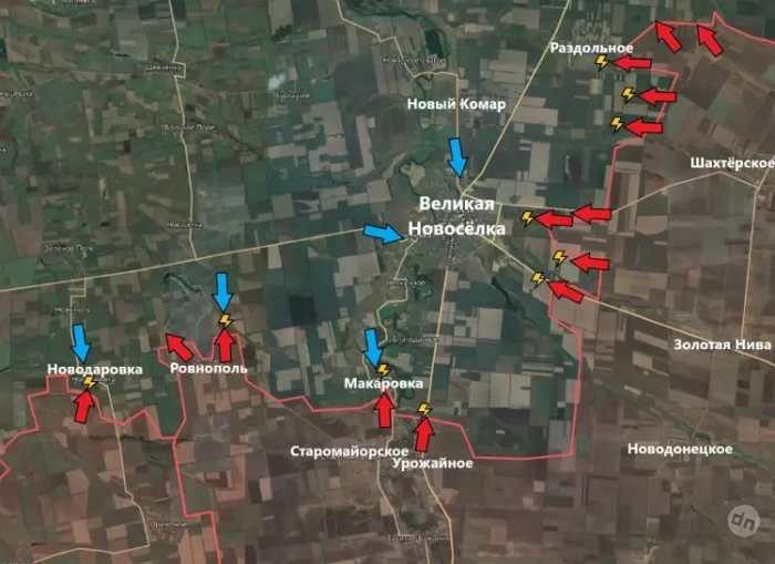 Армия России существенно продвинулась к востоку от Великой Новосёлки. Наши бойцы подобрались уже к окраинам этого посёлка городского типа. Враг активно заводит к населённый пункт резервы, предчувствуя скорое начало штурма.
