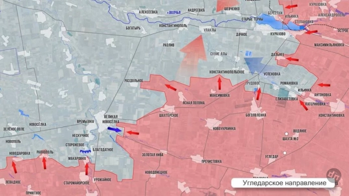 На Угледарском направлении ВС РФ дошли до окраин Великой Новосёлки. За три дня наши подразделения преодолели около 9 км, минно-взрывные заграждения, сопротивление опытных FPV-расчетов, несмотря на дожди, сегодня уже продавливают позиции врага в восточной части поселка. Развивается наступление в междуречье рек Кашлагач и Шайтанка. Село Раздольное, что севернее на трассе по большей части под нашим контролем. Западнее него ВСУ огрызаются только в ротном опорном пункте вдоль дороги. Северо-западнее Шахтёрского идут бои за лесополосы. В Трудовом ВС РФ заняли новые позиции в центре села. Южнее Курахово продолжается ликвидация кармана: ВС РФ контролируют Елизаветовку, Ильинку и частично Романовку.