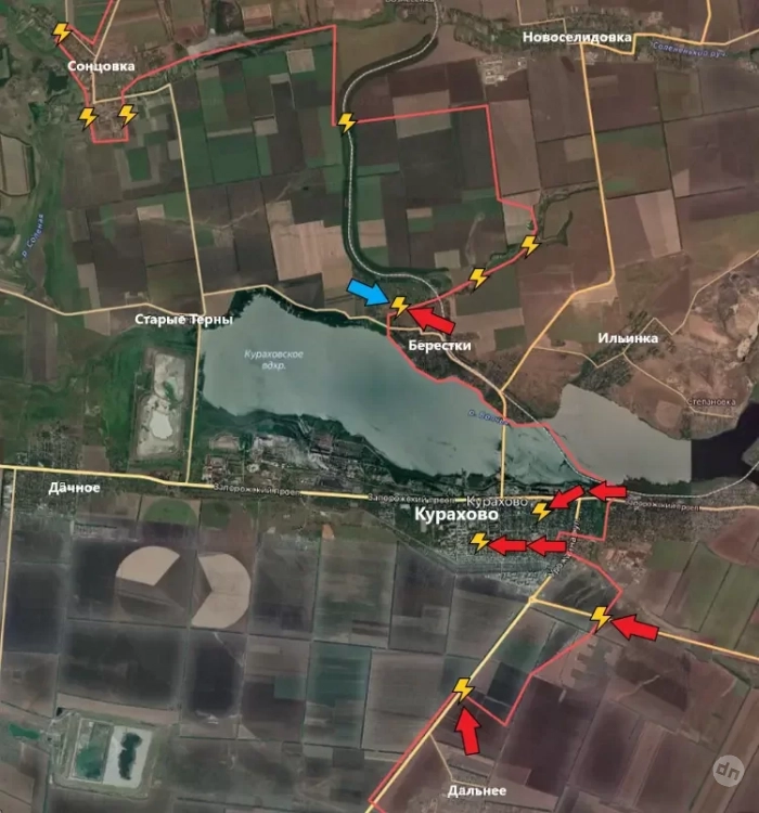 Встречные боестолкновения идут в дачах северо-западнее Берестков. На этом участке враг контратакует и не позволяет продвинуться в сторону Старых Терн. Учитывая крайне ожесточённое сопротивление противника в районе Сонцовки и Берестков, можно сделать вывод, что ВСУ очень уж не хотят, чтобы подразделения ВС РФ зашли в Старые Терны и взяли под огневой контроль путь снабжения / отступления ВСУ западнее Курахово, пишет PulsePen.