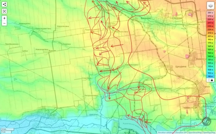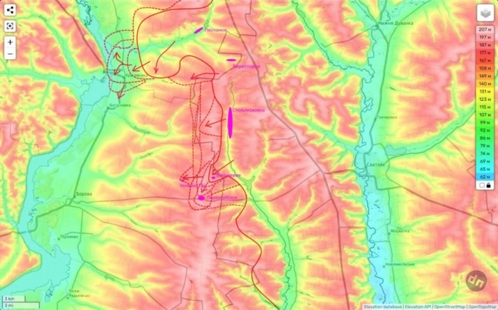 Это уже спуск с высот в долину реки Оскол. А еще это заход в тыл группировке противника удерживающего дорогу вдоль реки в районе н.п. Богуславка.