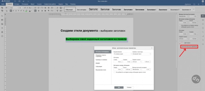 Помимо верхнеуровневой настройки в программе можно задать и другие более точечные параметры для композиции текстов. Для этого нажмите вкладку Дополнительные параметры на правой Боковой панели интерфейса редактора. В результате появится окно Абзац – дополнительные параметры, в котором можно прописать все необходимые требования к документу.