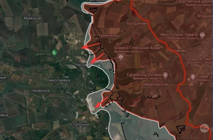 В районе Часов Яра ВС РФ продвигаются в лесном массиве. Судя по информации с мест, наши войска усилили натиск и севернее города, от Калиново, и южнее - вдоль трассы на Константиновку, охватывая город по большой дуге.