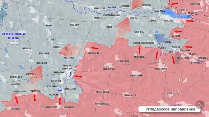 На Угледарском участке ВС РФ отбили около 20 км² восточнее Благодатного и ведут ожесточенные бои западнее Раздольного. Дерзким рейдом наши прошли в тыл гарнизону ВСУ в Великой Новосёлке и высадили десант в Новый Комар, сообщает в Telegram-канале Олег Царёв. ВСУ контратакуют, чтобы не допустить прорыва ВС РФ к Новоочеретоватому, который позволит нашим выйти в тыл ВСУ у Днепропетровской обл и в тыл Покровской группировке. Севернее Богоявленки ВС РФ вышли к ротному опорному пункту перед Успеновкой и усилили давление на Трудовое с севера. Из Ильинки, об освобождении которой объявило сегодня МО, ВС РФ ведут штурм Романовки, Веселого Гая. Подошли наши и к восточным окраинам Анновки. В Курахово отмечено значительное продвижение наших штурмовиков в центре, зона боёв расширяется и на юг и подходит к мкр Южный.