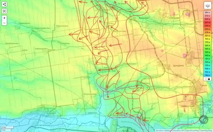Наши штурмовые части продолжают пытаться овладеть н.п. Новопустынка. Также мы пытамеся пройти севернее н.п. Жёлтое по жд путям. Цель - н.п. Шевченко. Если ным удастся его взять под контроль, он может послужить отличной базой для дальнейшего обхода Покровска с запада.