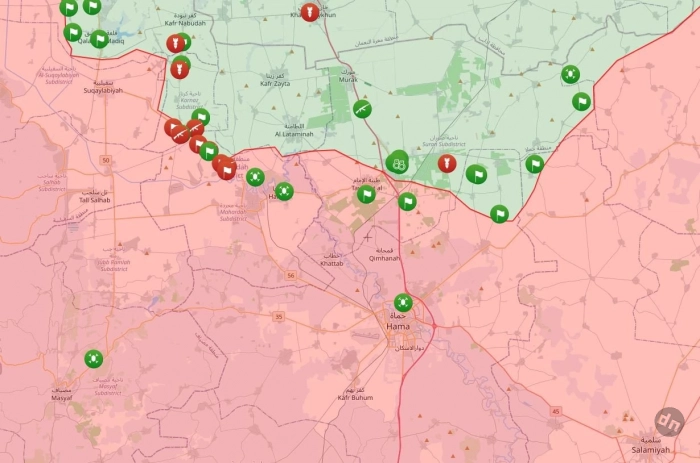 В Кяфр-Зейте и Аль-Латамне сохраняется присутствие боевиков, а по Хан-Шейхуну и Маарет Ан-Нуману работают бочковыми бомбами вертолеты сирийских вооруженных сил. В Хальфае, Тайбат-Аль-Имаме и Маардасе обстановка стабильная, города под контролем правительства.