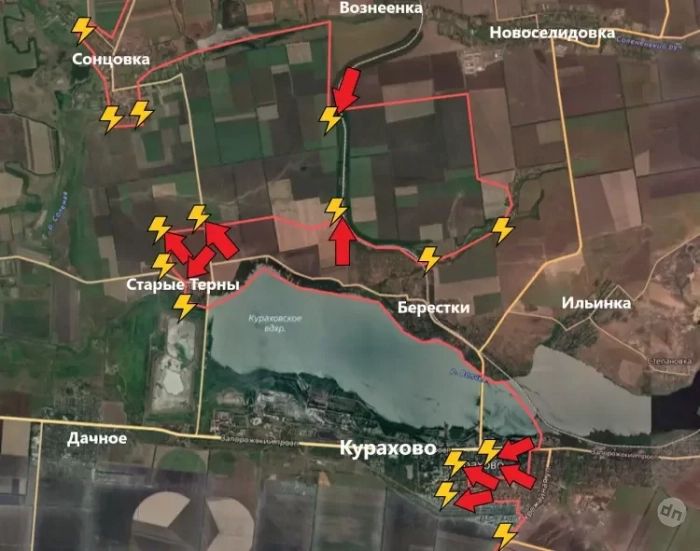Штурмовые отряды Армии России зашли в Старые Терны, которые располагаются на северо-западе от Кураховского водохранилища. Как минимум половина этого скромного населённого пункта за нашим бойцами. Можно ли будет продвигаться отсюда на юг, пока не очень понятно. Известно, что несколько недель назад ВСУ подорвали дамбу на этом участке. А вот дорога снабжения ВСУ (через Дачное на Курахово) находится под нашим огневым контролем.