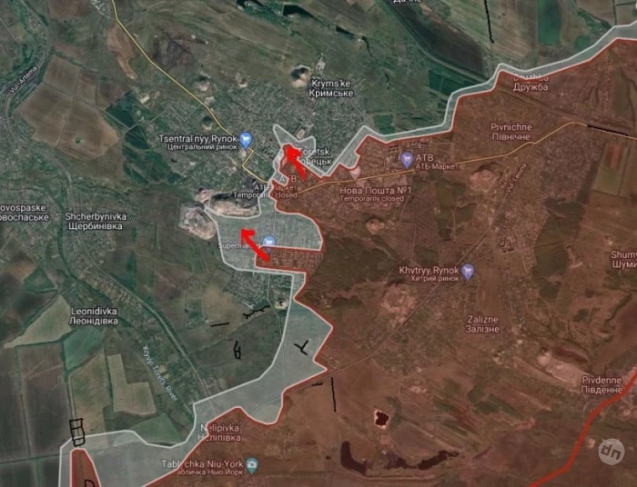 На Торецком направлении в центральной части Торецка российские войска продолжаются встречные бои вдоль улиц Героев Труда, Мирная и Грушевского, информирует Telegram-канал "БелВПО".