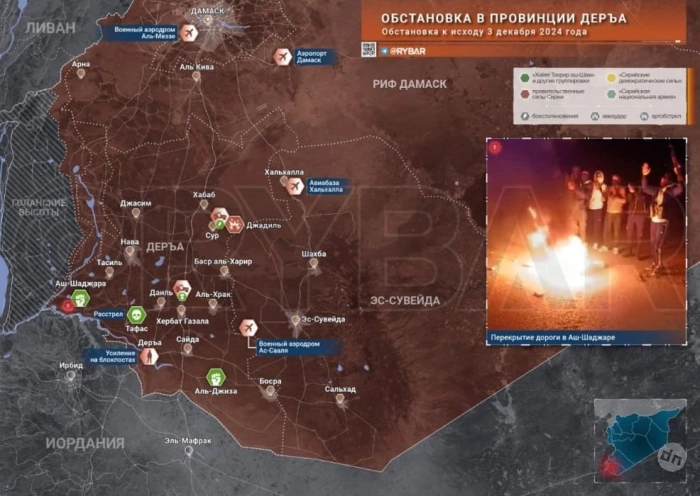 На фоне этого в сельской местности провинции происходят нападения спящих ячеек, а также протесты. В Аль-Джизе местные жители вышли в поддержку наступления боевиков в Хаме и Алеппо, а в Аш-Шаджаре перекрыли горящими покрышками одну из трасс, сообщает Telegram-канал "Рыбарь".