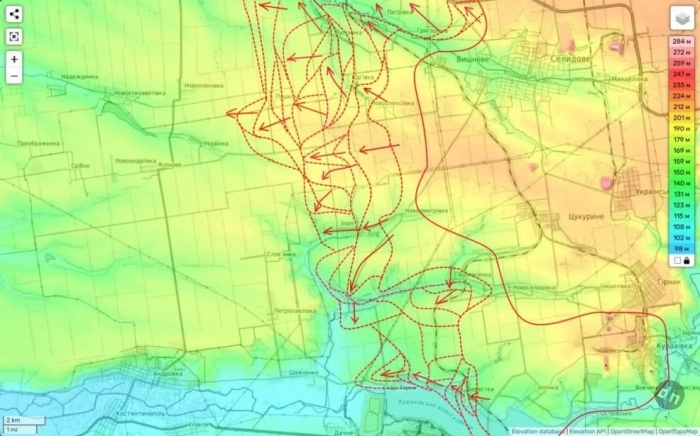 Чуть южнее и одновременно западнее Селидово, в районе Пушкино, также есть небольшие успехи по направлению к н.п. Украинка.