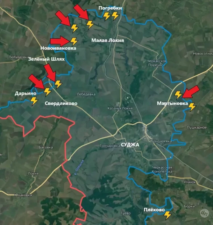 В свою очередь PulsePen информирует о том, что в настоящее время продолжаются бои практически по всему западному участку на Курском направлении. Встречные бои идут восточнее Новоивановки, в районе Погребков, южнее Зелёного Шляха - в районе трассы на Суджу, близ Дарьино и Николаево-Дарьино. Существенных изменений ЛБС не зафиксировано.