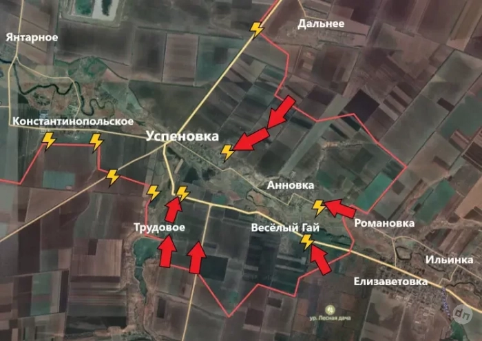 На Успеновском направлении произошло важнейшее событие произошло на участке. Подразделения ВС РФ прорвали оборону ВСУ и прорвались из Дальнего на северо-восточные окраины Успеновки в район сельскохозяйственных построек. Идёт закрепление на позициях. Враг контратакует. Угроза физического окружения противника в Анновке и Весёлом Гае реальна. ВСУ наносят удары дронами, пытается отбить ферму и оттеснить наши подразделения. В целом ситуация для противника в «успеновском кармане» действительно критическая. Вполне вероятно, что подразделения 79-ой бригады ВСУ вынуждены будут отходить с боями из Зелёного Гая и Анновки к Успеновке, если в ближайшие часы ситуация не улучшится.