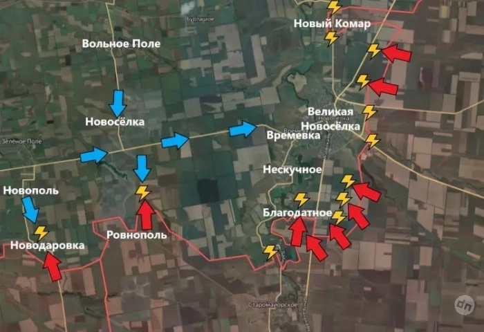 На Времьевском направлении в районе населённых пунктов Раздольное и Новый Комар ежедневно идут ожесточённые столкновения. Украинские формирования продолжают активные контратаки на позиции российских сил, сообщает в Telegram-канале военкор Евгений Лисицын.