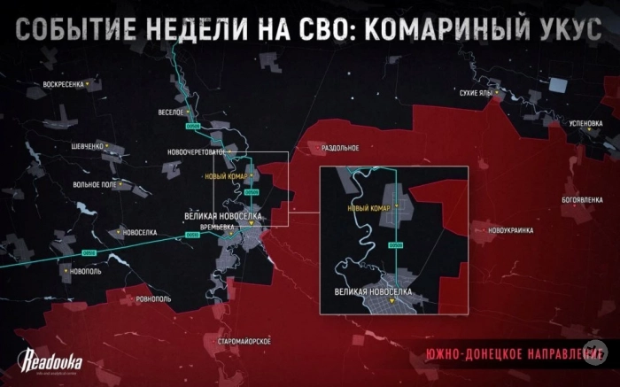 Самые ожесточенные бои сейчас идут за Новый Комар - ВСУ предпринимают попытки контратаковать и вновь вытеснить русскую армию. Цель сражения, конечно, не сама полупустая деревня, а дорога, ведущая на север, через нее происходит снабжение украинских войск в Великой Новоселки. Само поселение пока под контролем противника, но делу время. С его захватом ВС РФ откроют себе дорогу для уничтожения всей линии укреплений, тянущейся на запад, и тем самым создадут проблемы ВСУ на застывшем фронте Запорожья, сообщает Telegram-канал Readovka.