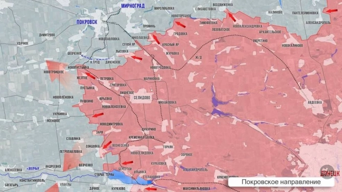 На Покровском направлении Минобороны объявило освобождение Берестков. Наши срезали карман между Старыми Тернами и Сонцовкой. Штурмуя северо-западную часть Солнцовки, продвинулись в полях по направлению к Заре. Формируя южный охват Покровска, наши выровняли линию между Жёлтым и Пушкино, а после освобождения Новопустынки вошли в Новотроицкое и Шевченко. И по последним данным ВС РФ уже зачищают Новотроицкое, из которого противник после неудачной контратаки, потеряв колонну техники, отвел войска в соседнюю Успеновку. Эту Успеновку не надо путать с селом на р. Сухие Ялы.