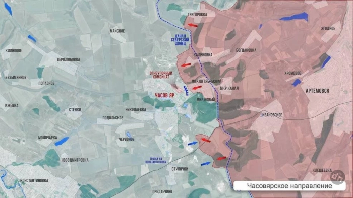 В Часов Яре мкр Октябрьский перешел под контроль ВС России. Несмотря на плотную работу нашей артиллерии, ВСУ ещё удерживает свои позиции на огнеупорном комбинате. Там продолжаются тяжелые бои.