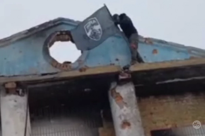 На видео, которое опубликовал Telegram-канале ANNA NEWS, боец забирается на крышу сильно разрушенного в результате боёв здания, снизу сослуживцы подсказывают ему, как лучше закрепить его.