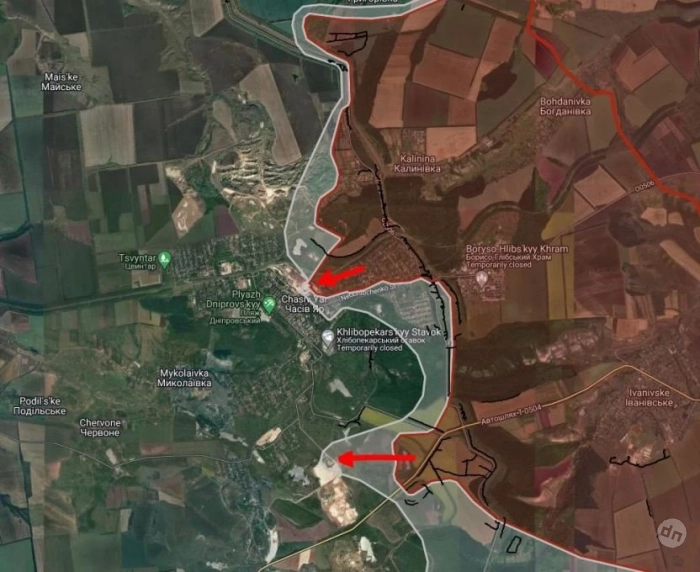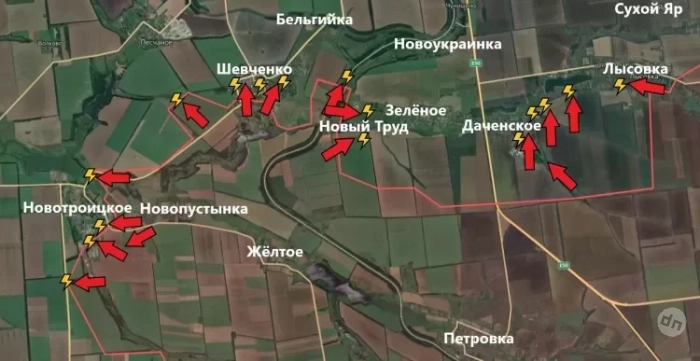 В Солнцевке российские войска имеют тактические успехи, продвинулись в центральной части населенного пункта на глубину до 700 м. Южнее Вознесенки под контроль ВС РФ перешел участок местности шириной до 2.05 км. Также российские войска ведут штурмовые действия южнее Старых Тернов, давят в направлении Дачное.