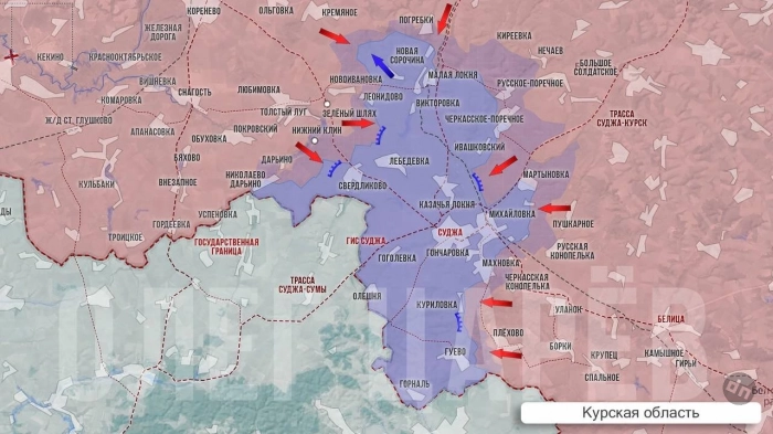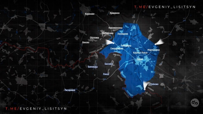 Южнее Суджи после освобождения Плехово российские войска не стали штурмовать в лоб укрепления у Куриловки, а двигаются в обход Гуево, по лесным массивам у границы. Похоже, что в этом движении они затронули часть территории Сумской области. Информацию об этом опубликовал украинский мониторинговый канал, и это вызвало переполох на украинских ресурсах. Согласно опубликованной карте, ВС РФ заняли территорию около двух квадратных километров возле приграничного села Александрия в Сумской области. С Украины одни заявляют, что граница на замке, и «их там нет», другие утверждают, что там болото и делать там нечего.