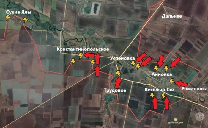 Штурмовые отряды ВС РФ обошли Константинопольское с востока, зашли на окраины села и закрепились. Сейчас ВСУ находятся на западных окраинах и пытаются дать отпор нашим бойцам.