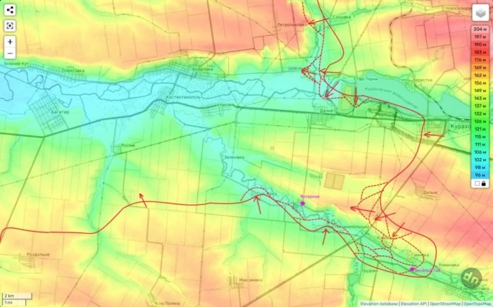 В северной части данного участка мы ведем наступление южнее реки Солёная с задачей обеспечения левого фланга главного удара группировки «Центр», наступающей в обход Покровска. Наше движение здесь идет довольно широким фронтом между Нововасильевкой и Новоелизаветовкой.