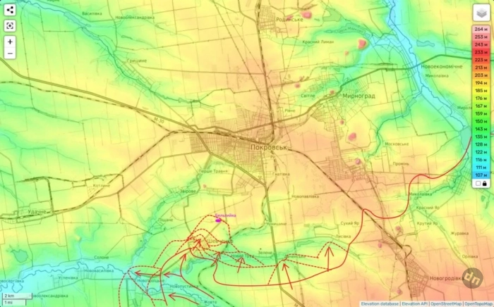 На Покровском направлении наши части, продолжая развивать наступление южнее Покровска, к вечеру сумели выйти в район н.п. Бельгийка и тем самым вышли уже практически на окраины г. Покровска, до которого им осталось пройти всего лишь одно поле (или 1,5 км). Также идёт сильное давление на позиции ВСУ в районе н.п. Песчаное.