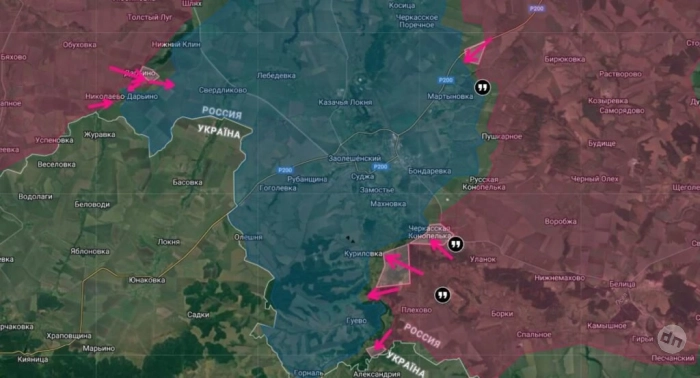 Военкор подчеркнул, что со стороны населённых пунктов Дарьино и Николаево-Дарьино тоже идут бои. Цель российских войск - выйти к селу Свердликово, которое тоже расположено на трассе с твердым покрытием. Также ВС РФ движутся в направлении Гуево, там тоже расположена асфальтовая дорога. Ее хотят взять под контроль, чтобы уничтожить противника в Судже.